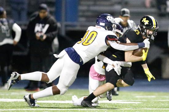 Senior Jack Machita quarterback was an efficient 8 for 12 for 171 yards and three touchdowns. Although held to 17 yards on five carries, sophomore standout Sam Brown caught three passes for 102 yards. His three touchdowns gave him 16 for the season – nine on the ground, and seven through the air. Brown’s six touchdowns last year helped merit a second-team All-Catholic honor.
