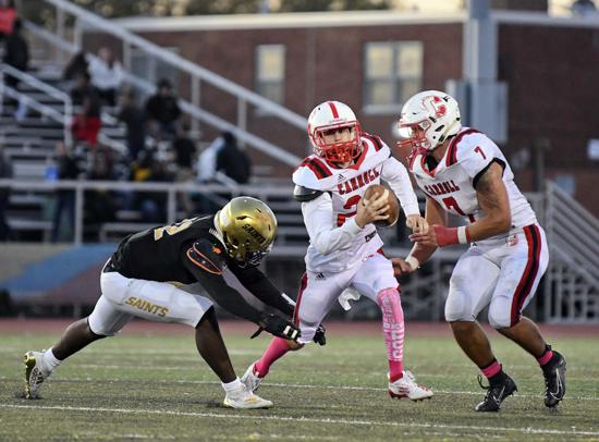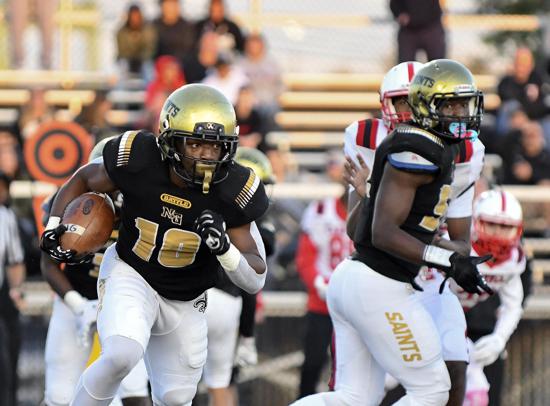 The Saints, who amassed a startling 571 yards of offense, raised their perfect record to 7-0 overall and 4-0 in the Catholic League Blue Division and appear poised to clinch their second title in three seasons.