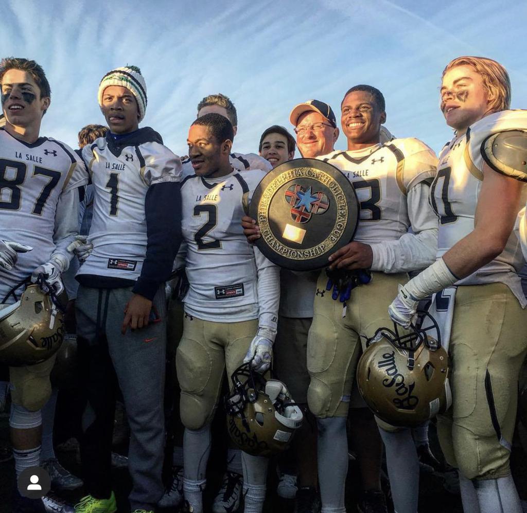 Pictured (L to R) Headen #2 and Eubanks #13 holding plaque after winning the Philadelphia Catholic League Title for La Salle in 2015. (Courtesy: Eubanks family)