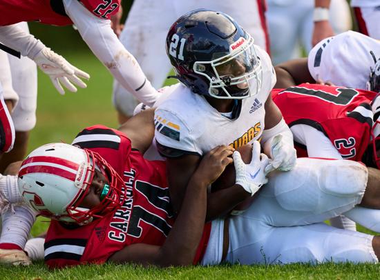 Seniors Jamir Robertson and Mao Howell each rushed for 105 yards. A Robertson run and a 16-yard pass from freshman quarterback Samaj Beals to senior Walt Clymer accounted for Roman’s scoring. Junior Jah Jah Boyd’s interception helped the Cahillites’ defense hold the Vikings to 58 total yards of offense.