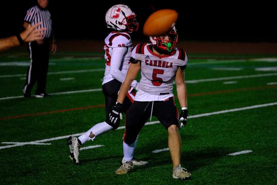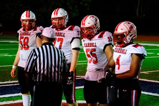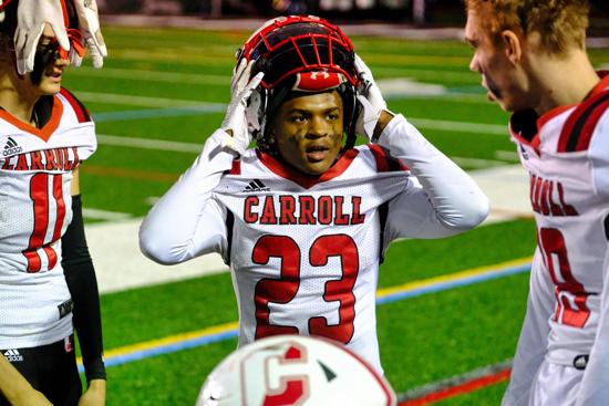 Statistically, freshman quarterback John Welde’s touchdown passes to sophomores Logan Maloney and Khalil Epps offset Carroll junior Hasaan Bailey (16 carries, career-high 80 yards), junior quarterback James Wright (touchdown run), and sophomore Mason Graham (four rushes for 59 yards and a touchdown).